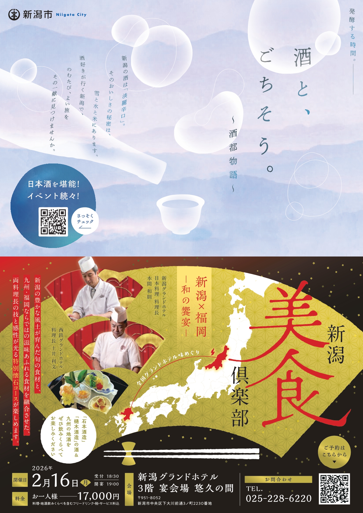 新潟グランドホテル和食料理長渾身の献立と、新潟の地酒を絡め食を楽しんでいただく会。 料理長の実演や酒蔵(石本酒造、樋木酒造)の方を交えてのトークなど